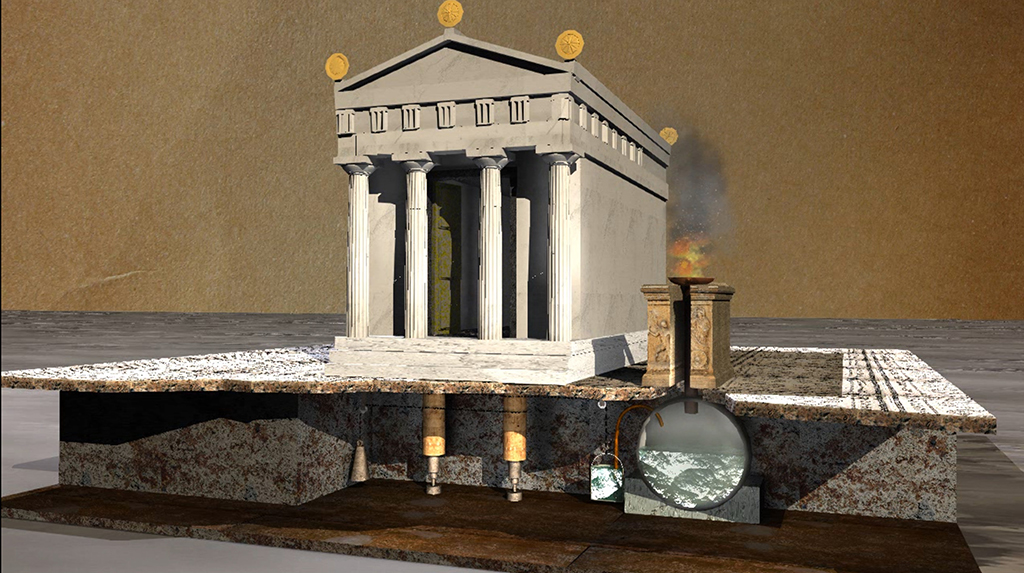 Meccanismo di apertura e chiusura automatiche delle porte di un tempietto, azionato da un braciere votivo. Il braciere era collegato a una caldaia che, generando vapore, azionava un sistema di trascinamento dei perni delle porte.