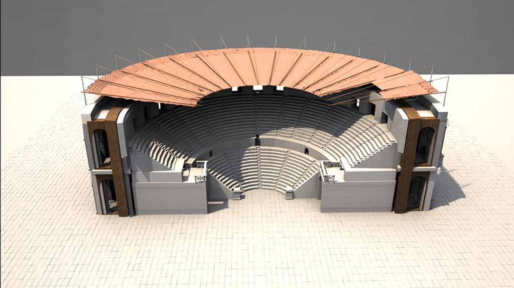 L’anfiteatro di Curione, interamente ligneo, era posto su piattaforme girevoli, in modo da poter formare due teatri indipendenti che consentivano due diverse rappresentazioni.